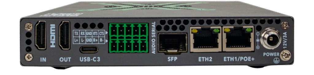 P-AVN-4 Mediesender/mottaker med HDMI, USB-C og lydtilkoblinger. Kan fungere som sender eller mottaker i et AV-system. Bruker JPEG XS, FIP/TDC (Flawless Image Profile), MPEG-4 (H.264), HEVC (H.265).
