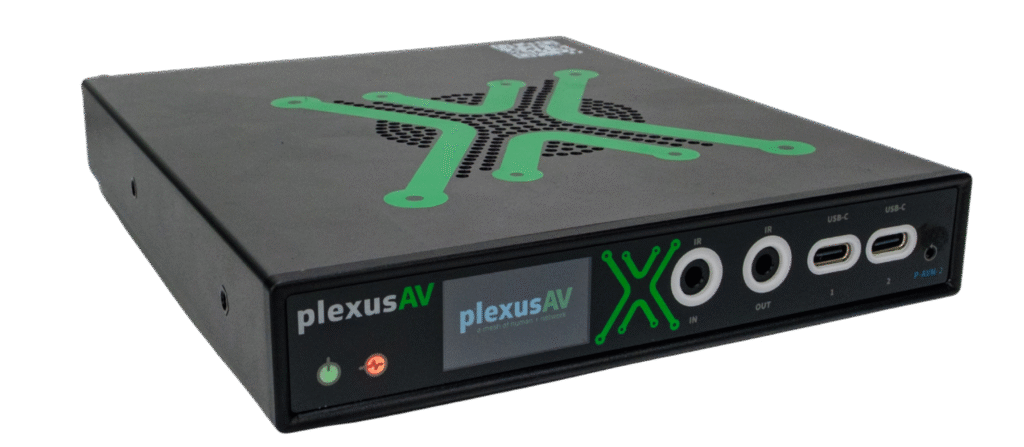 P-AVN-2 Mediesender/mottaker med HDMI, USB-C og lydtilkoblinger. Kan fungere som sender eller mottaker i et AV-system. Bruker MPEG-4 (H.264) og HEVC (H.265) for video.