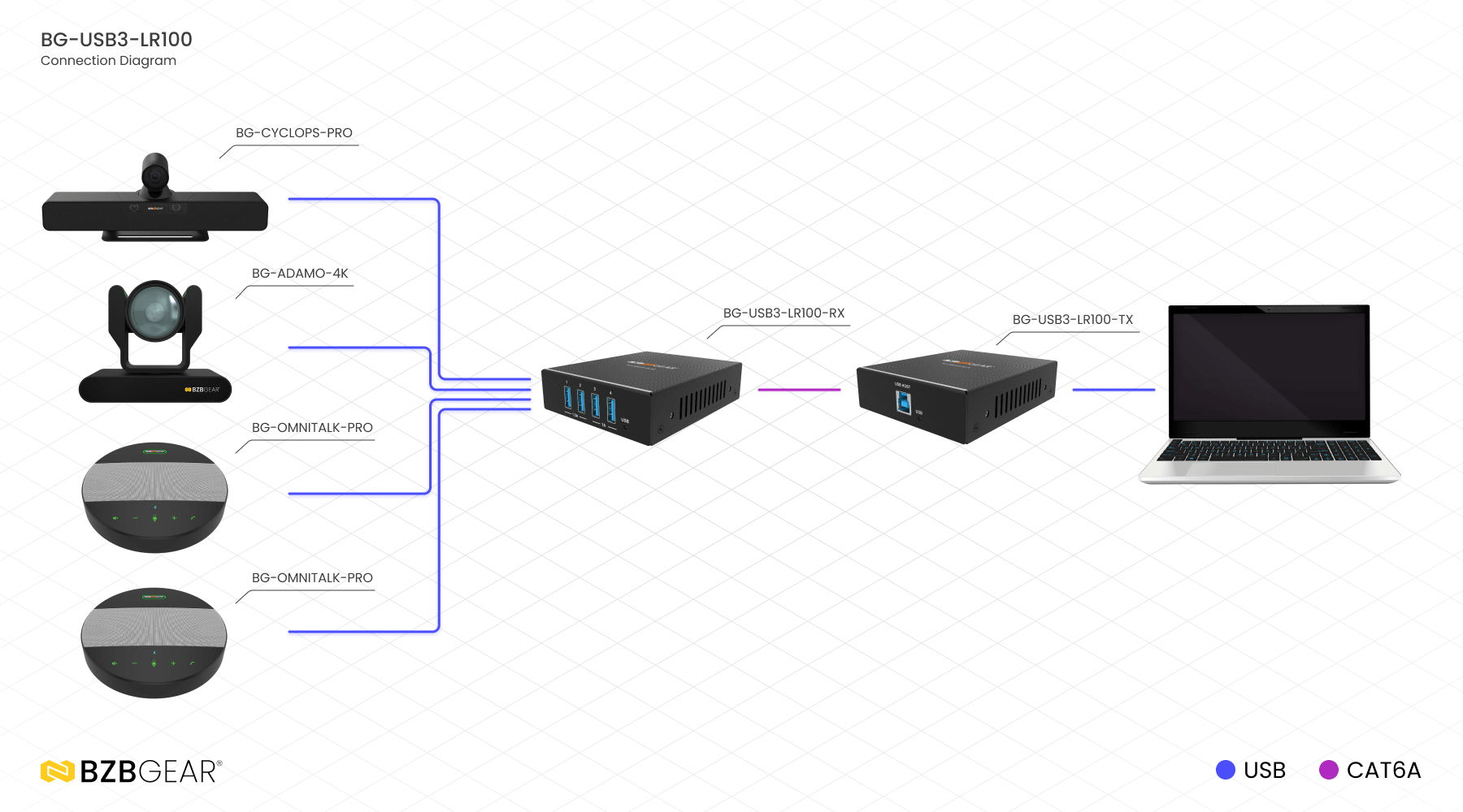 BG-USB3-LR100 USB 3.0-forlengeren er et essensielt verktøy for å utvide USB-tilkoblinger over lange avstander og kan overføre signaler opptil 100 meter (328 fot) via én CAT6a-kabel. Enheten er designet for pålitelighet og høy ytelse, og tilbyr raske dataoverføringshastigheter på opptil 5 Gbps, noe som gjør den ideell for industrielle miljøer og større installasjoner. Senderen har USB 3.0 Type B-inngang, FSYNC GPIO-inngang og RS-232 pass-through, mens mottakeren tilbyr fire USB 3.0 Type A-utganger, FSYNC GPIO-utgang og RS-232 pass-through. Systemet støtter toveis 24V Power over Cable (PoC), noe som forenkler strømhåndtering og installasjon. Les mer