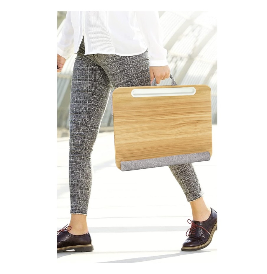 Det bærbare skrivebordet 20115267 har en solid MDF-overflate med treeffekt og en behagelig polstret underdel. Utstyrt med håndtak er den lett å transportere og kan også brukes utenfor hjemmet.