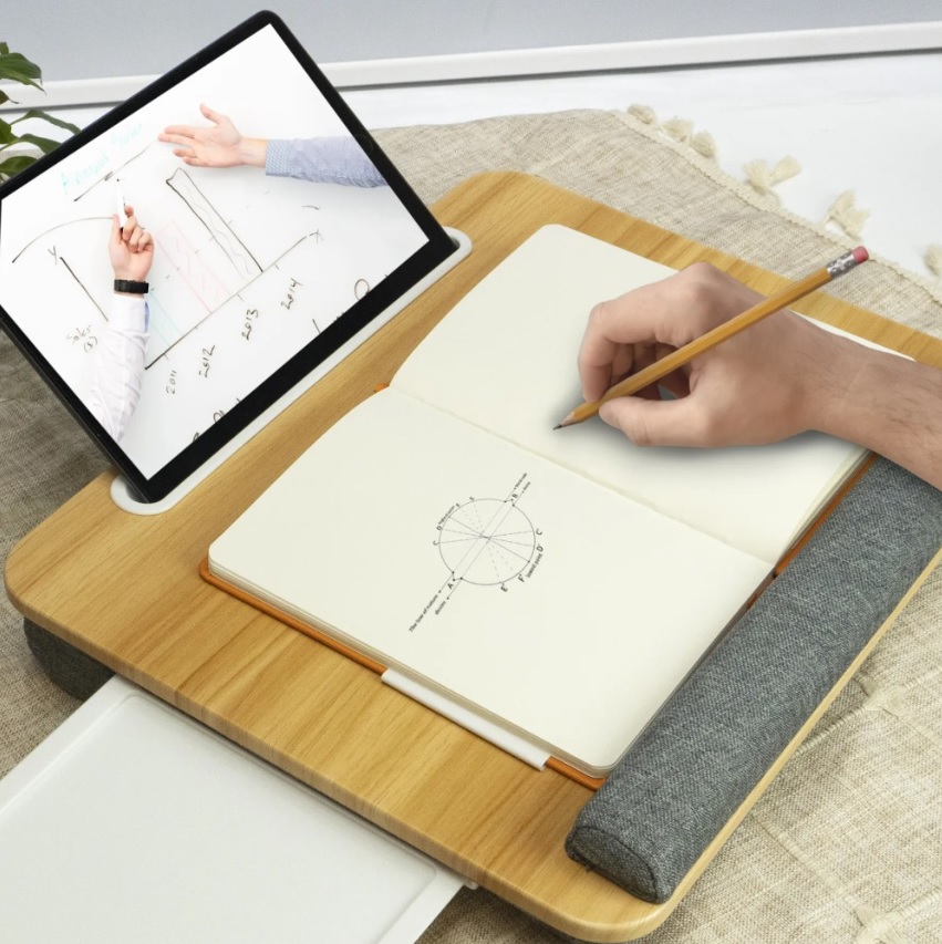 Den polstrede puten i bunnen av brettet tilpasser seg knærne og gir større komfort og stabilitet; Takket være den integrerte håndleddstøtten foregår skrivingen uten tretthet i hånden eller håndleddet.