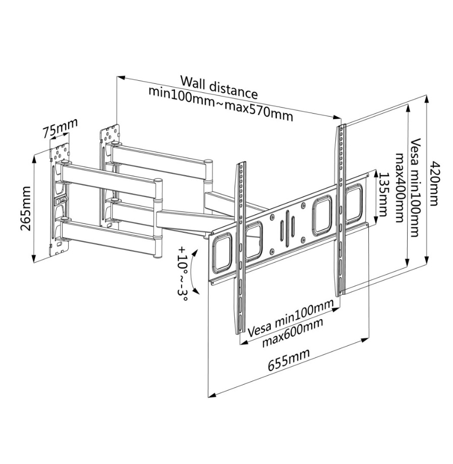 Full bevegelse med tiltjustering fra -3° til +10°, rotasjon +/- 45° og veggforlengelse fra 100 til 570 mm