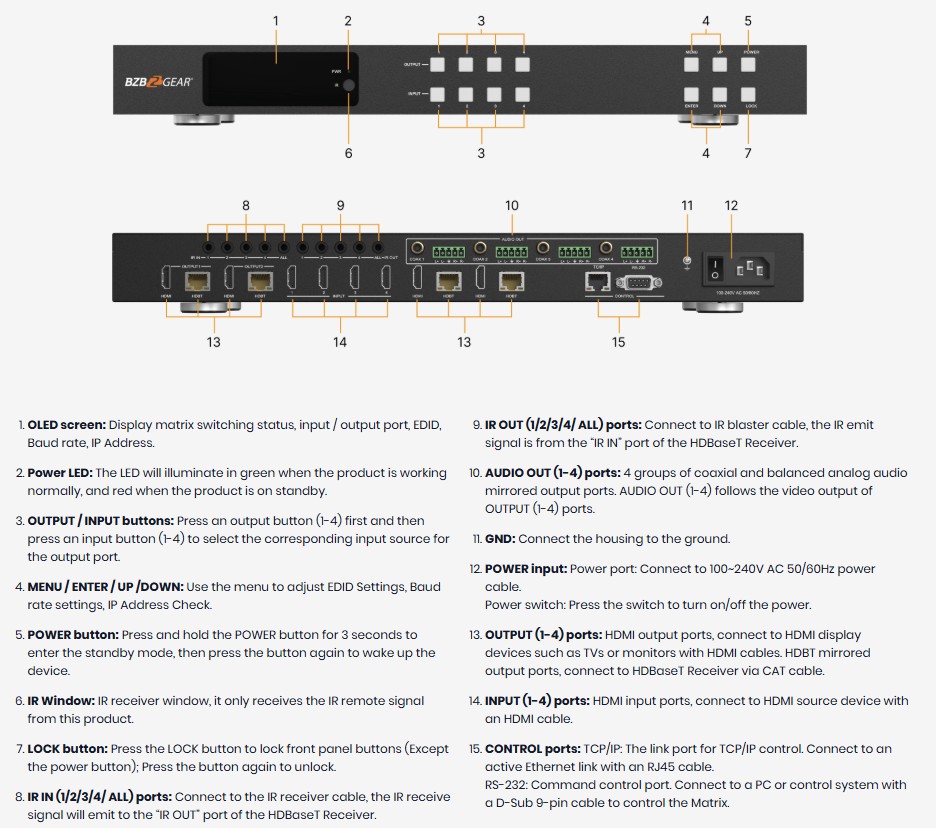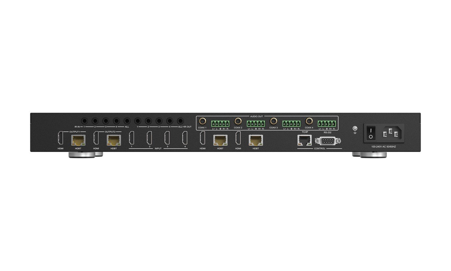 I tillegg kan HDMI Matrix Switcheren nedskalere video fra 4K til 1080p for hver utgangsport ved behov. Den støtter Power over Cable (PoC) på alle HDBaseT-porter, slik at du ikke trenger ekstern strømforsyning til HDBaseT-mottakeren.