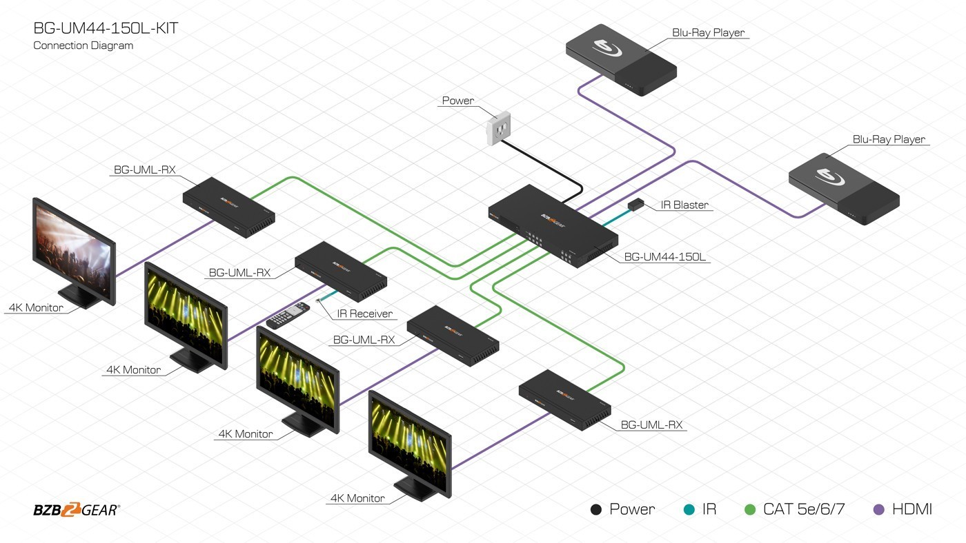 Vi introduserer BG-UM44-150L-KIT HDMI Matrix Switcher og Extender – en kraftig enhet som lar deg enkelt koble opptil fire HDMI-kilder til åtte skjermer! Med fire HDMI-utganger speilet til fire HDBaseT-utganger kan du sende videosignaler over lengre avstander enn med en standard HDMI-kabel. For eksempel kan signalet ved 1080p oppløsning sendes opptil 150 meter, og opptil 120 meter ved 4K – noe som gir deg stor fleksibilitet i oppsettet ditt. Les mer