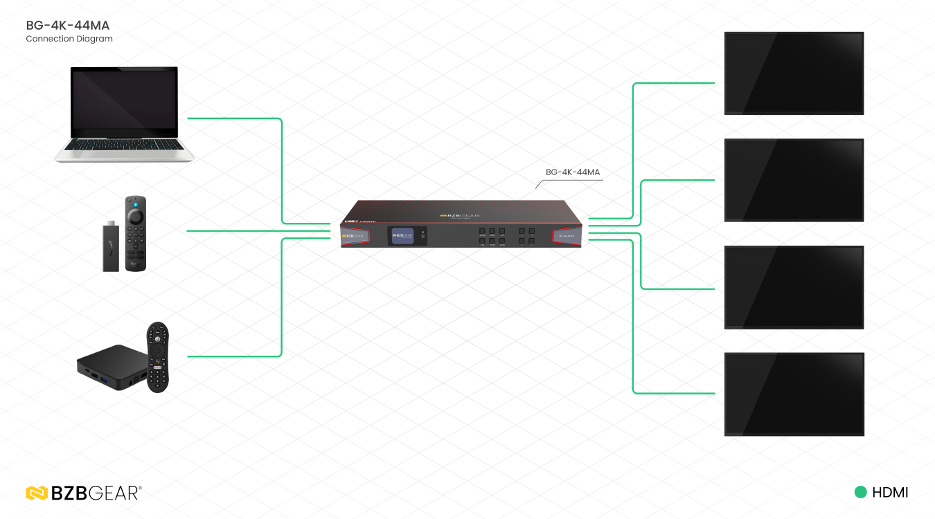 BG-4K-44MA støtter oppløsninger opptil 4K@60Hz 4:4:4 med HDR. Med 18 Gbps ukomprimert båndbredde rutes HDMI-signaler uten tap av kvalitet. Alle HDMI-porter på denne matrisen er HDCP 2.2-kompatible. Enheten har også automatisk nedskalering på alle utganger, som sikrer kompatibilitet med eldre skjermer. BG-4K-44MA støtter også digital S/PDIF og balanserte lydutganger.