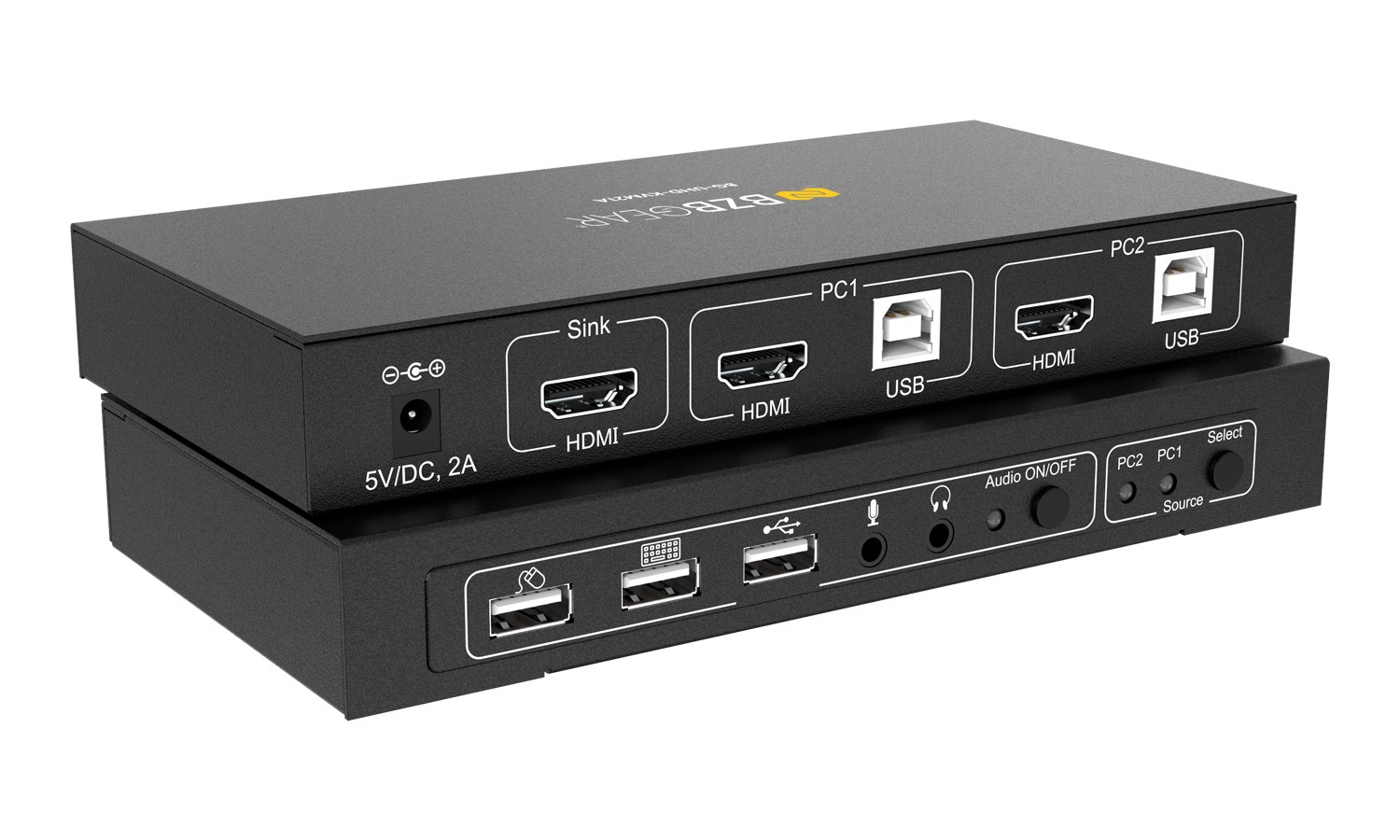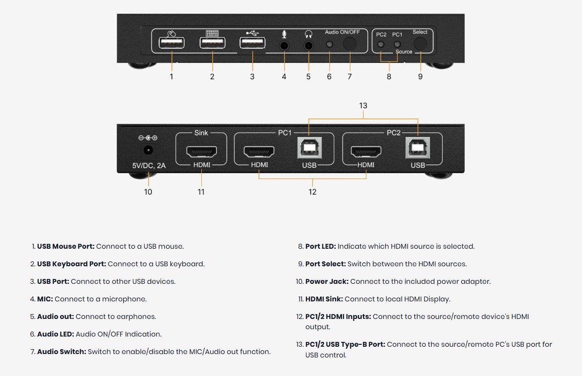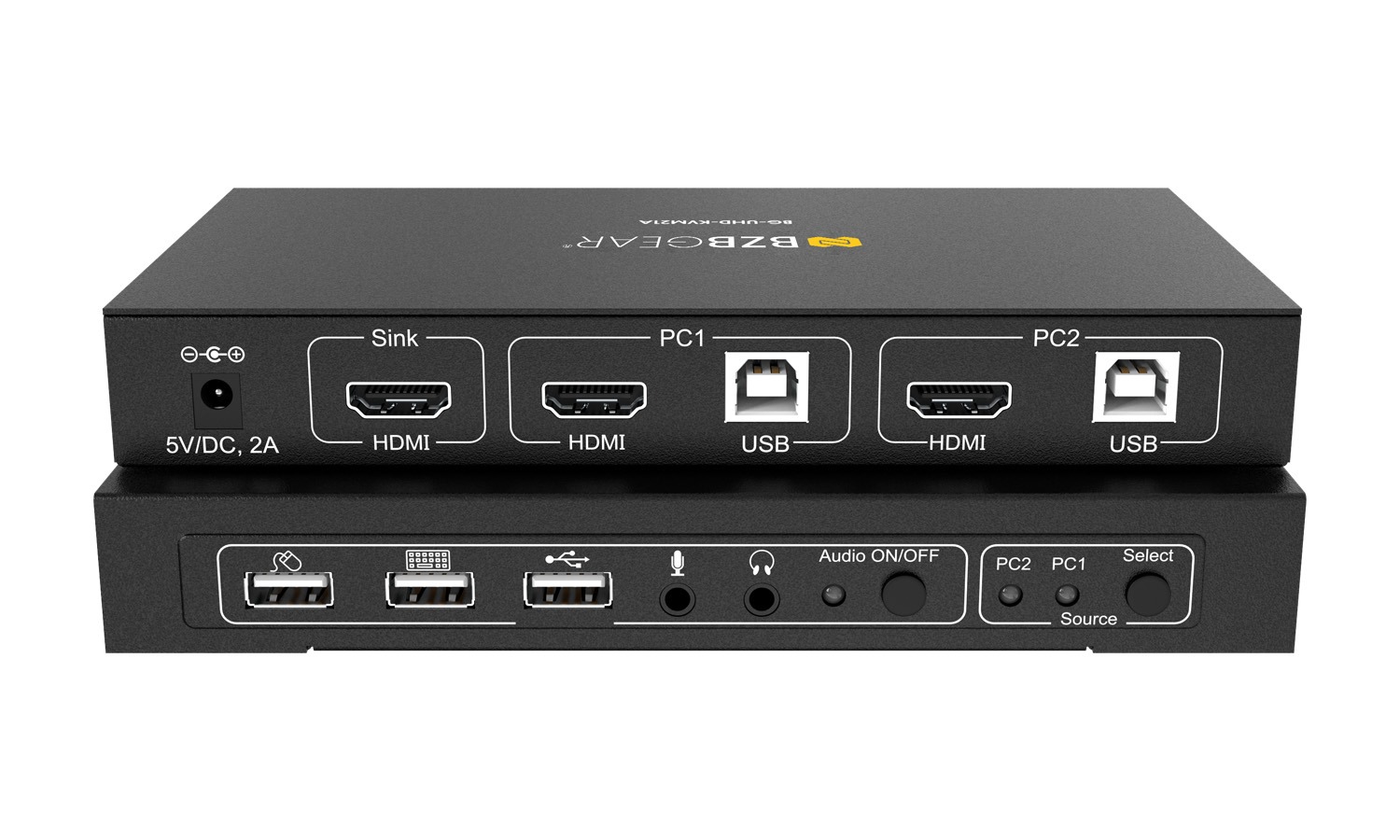 Baksiden av BG-UHD-KVM21A er utstyrt med to PC-tilkoblinger, hver med én USB 2.0 type-B vertsport og én HDMI 2.0-inngang. Det finnes også én HDMI 2.0-utgang for tilkobling til en skjerm. På frontpanelet finnes tre USB 2.0-porter for tastatur, mus og en ekstra port for andre enheter. BG-UHD-KVM21A har også 3,5 mm lydtilkoblinger for mikrofon og hodetelefoner/høyttalere.