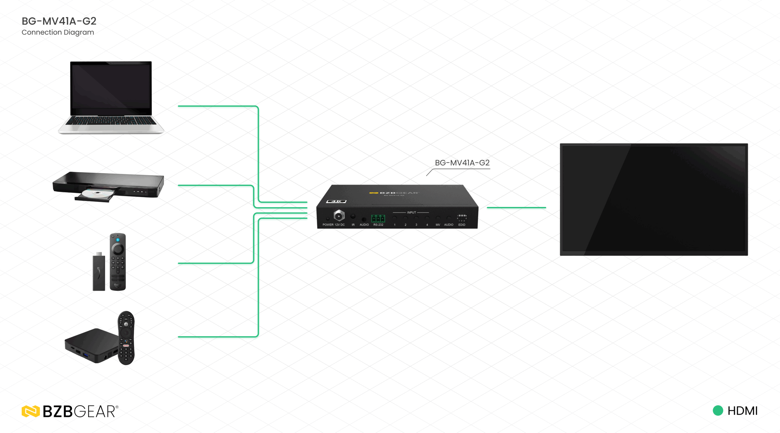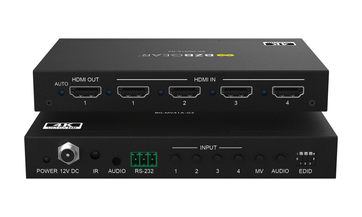 Lyd kan velges uavhengig og sendes ut via den analoge porten med støtte for LPCM, Dolby Digital, Dolby Digital Plus og DTS. Med automatisk/manuell inngangsbytte, jevne overganger mellom visninger og en skjermmeny (OSD) tilbyr BG-MV41A-G2 både ytelse og fleksibel kontroll. Administrasjon er enkelt via frontpanelknapper, IR-fjernkontroll eller RS-232-kommandoer, mens avansert EDID-håndtering sikrer pålitelig kompatibilitet – alt i et kompakt format utviklet for profesjonelle AV-installasjoner.