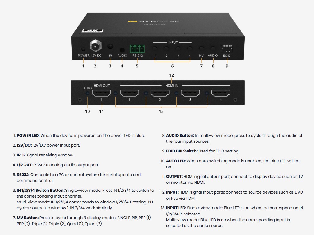 Den støtter oppløsninger opptil 4K@30Hz med 10,2 Gbps båndbredde og er i samsvar med HDMI 1.4b- og HDCP 1.4-standardene. Brukere kan velge mellom åtte allsidige visningsmoduser, inkludert enkel visning, bilde-i-bilde (PIP), bilde-ved-bilde (PBP), trippelvisning og firevisning – noe som gjør den ideell for overvåkning, kontrollrom og presentasjoner.
