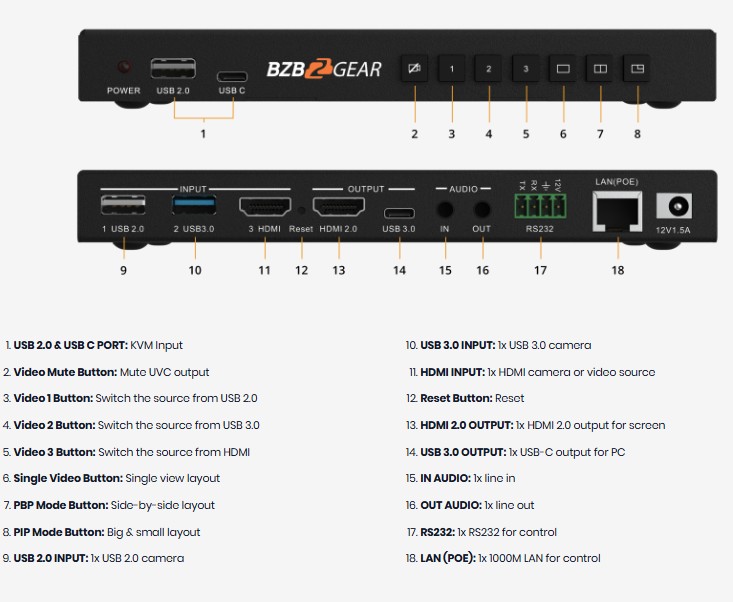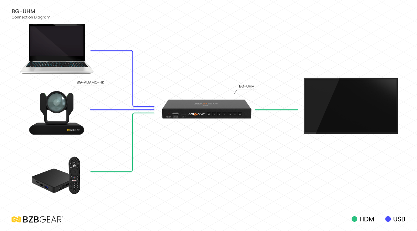 BG-UHM støtter opptil tre videokilder, inkludert USB 3.0, USB 2.0 og HDMI-innganger, noe som gjør det mulig å integrere ulike enheter som webkameraer, bærbare PC-er og dokumentkameraer. Med sine tilpassbare videomiksealternativer leverer BG-UHM resultater i profesjonell kvalitet og lar brukerne lage unike layouter som Picture-in-Picture (PiP), side-ved-side og store/små overlegg. Disse layoutene kan enkelt konfigureres via det brukervennlige webgrensesnittet, noe som gjør enheten egnet for både nybegynnere og erfarne brukere.