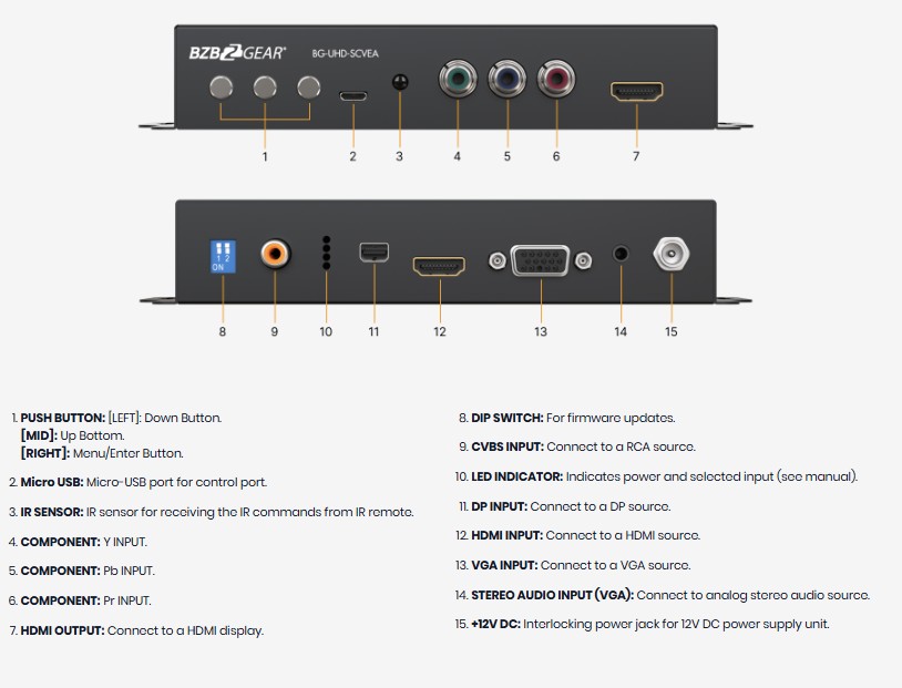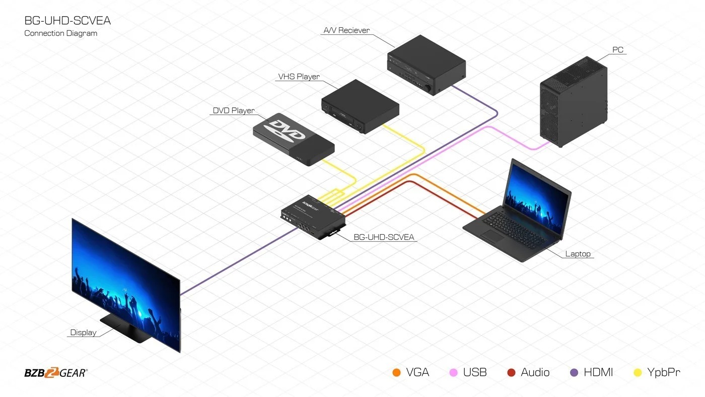 Med sitt allsidige utvalg av innganger er BG-UHD-SCVEA den perfekte løsningen for brukere som ønsker å konvertere eldre mediaformater for bruk i moderne A/V-systemer.