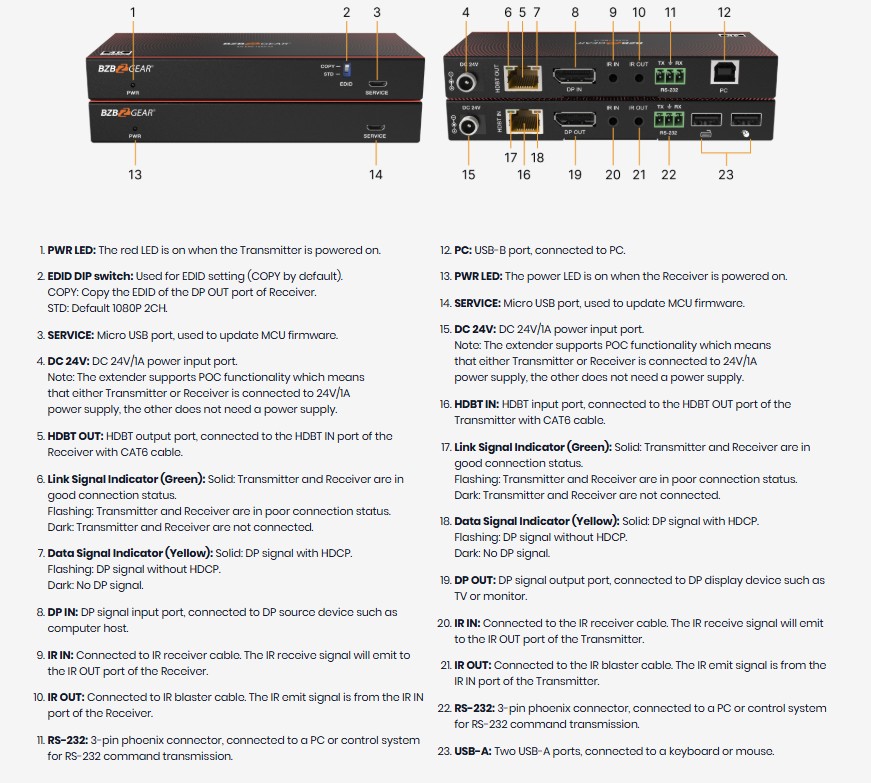 BG-EXD-150C konverterer DP-signalet til et standard HDBaseT-signal som sendes via en nettverkskabel. Takket være toveis IR-pass-through kan brukere enkelt kontrollere kildeenhet eller skjerm med en fjernkontroll. Forlengeren støtter videoutganger opptil 4K2K@60Hz YUV 4:4:4 og tilbyr også toveis POC-funksjon.