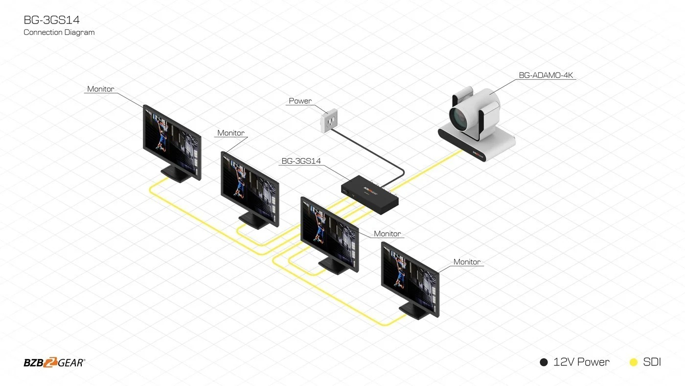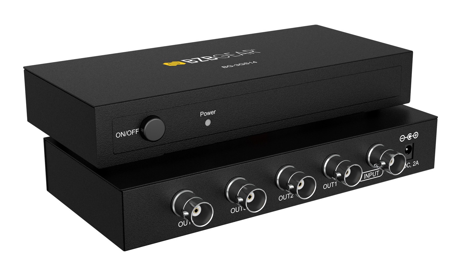 BG-3GS14 er en 1x4 3G-SDI-splitter som deler én SDI-inngang til fire SDI-utganger samtidig. Med sin reklockingsfunksjon kan den også forlenge et videosignal for langdistanseoverføring. Dette pålitelige og kraftige verktøyet gir stabile tilkoblinger i en rekke ulike scenarier, som å legge til flere utganger for overvåkning av en videostrøm på ulike skjermer, splitte signalet og kaskadekoble til flere skjermer, eller forlenge et SDI-signal. Les mer
