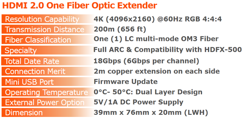 4K HDMI 2.0 profesjonell forlenger i miniformat for mode-fiber OM3 opptil 200 m. Forlengeren sender datasignaler transparent og ukomprimert, selv når man bruker den sammen med den medfølgende kobberkabelen på 2 meter. Med denne tilkoblingskabelen kan forlengeren til og med monteres i små rom med begrenset plass.