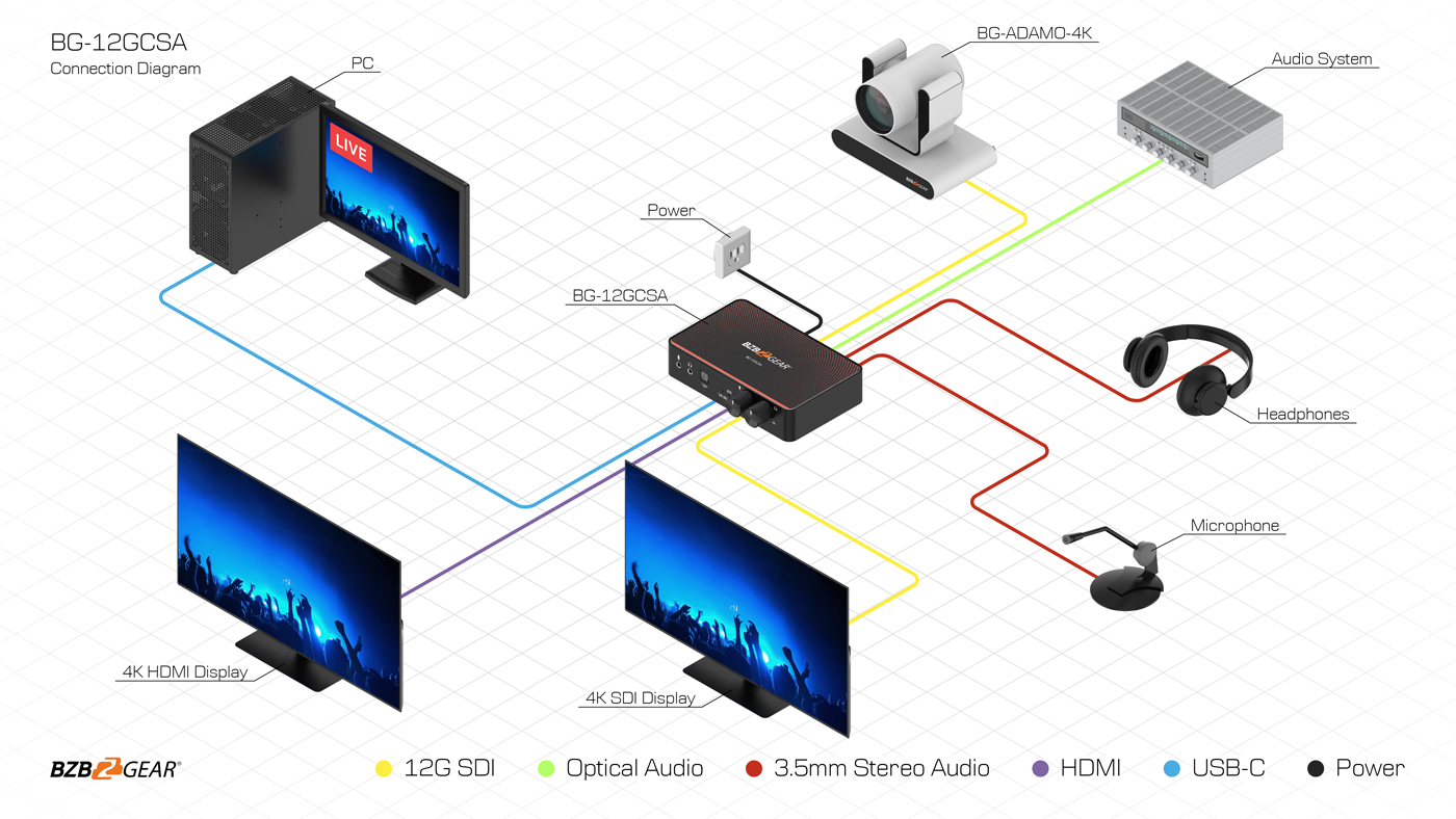 BG-12GCSA er en USB-C 12G-SDI videoinnspillingsenhet med scaler, HDMI 2.0/12G-SDI loopout og lyd som gir en profesjonell måte å fange SDI-videosignaler på. Den bruker en USB 3.1 Type-C Gen 1 (USB 3.0) tilkobling, som muliggjør høyhastighetsoverføring av data. SDI-inngangen og loopouten kan støtte opptil 4K2K@60. Les mer