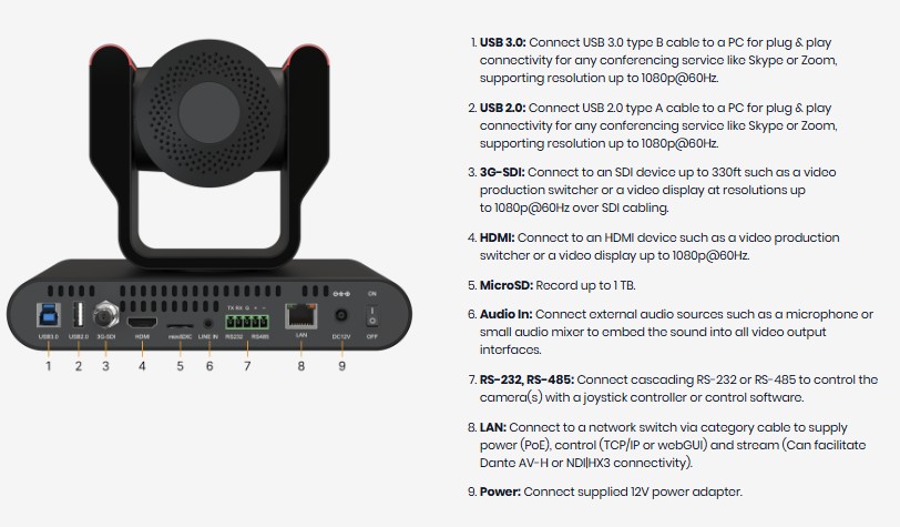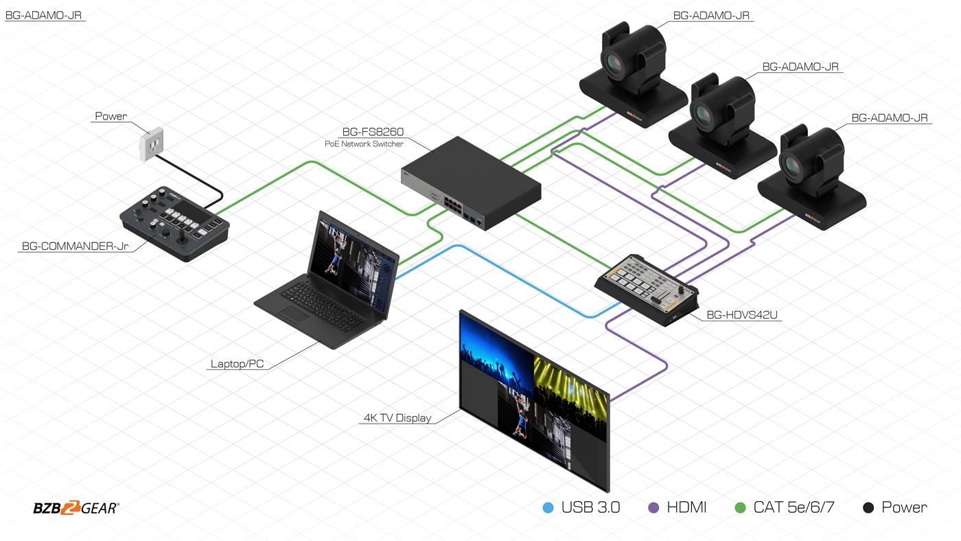 BG-ADAMO-JR er et helt nytt Full HD PTZ-kamera med tre objektivalternativer: 12x optisk zoom med 70,3° FOV, 20x optisk zoom med 60,04° FOV og 30x optisk zoom med 58,1° FOV. Det har jevne PTZ-funksjoner, avansert bildebehandling og fleksible tilkoblinger. Modellen støtter NDI|HX3 (BG-ADAMO-JRND) og Dante AV-H (BG-ADAMO-JRDA). Kamerans Auto-tracking bruker AI for å oppdage og følge mennesker raskt og presist. Systemet krever bare ett kamera og én linse. Støtter HDMI, SDI, USB 2.0, USB 3.0 og LAN. IP-streaming støttes også for fleksible arbeidsflyter. Les mer