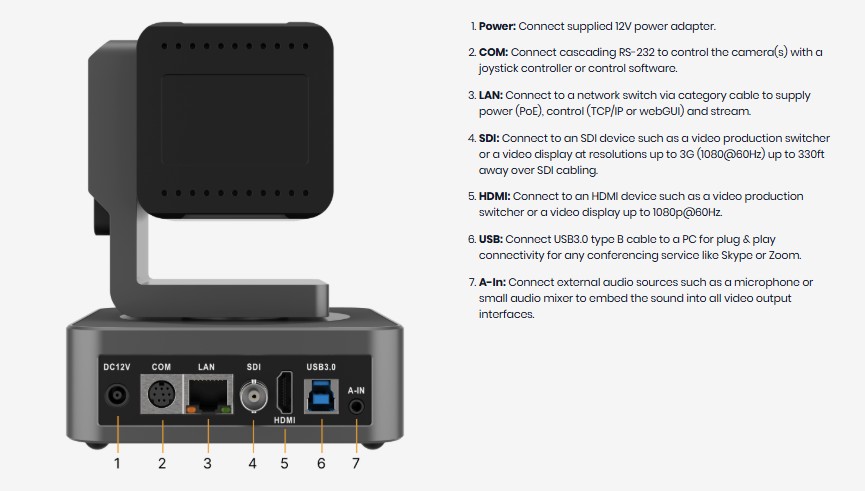 Kameraet kan ta opp i opptil 1080p 60Hz for klare og skarpe bilder. Det tilbyr samtidig HDMI-, 3G-SDI-, USB 3.0- og IP-strømmingsutganger, noe som gjør integreringen enkel.