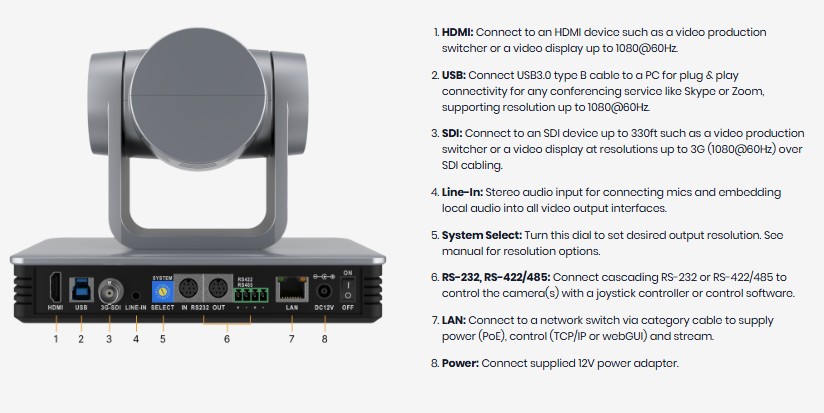 Samtidige HDMI-, 3G-SDI- og USB 3.0-utganger gir stor fleksibilitet. Støtte for ONVIF, RTSP og RTMP gjør integrering med YouTube, Twitch og Facebook enkelt. En 3,5 mm inngang gjør det mulig å legge inn eksternt lydutstyr.