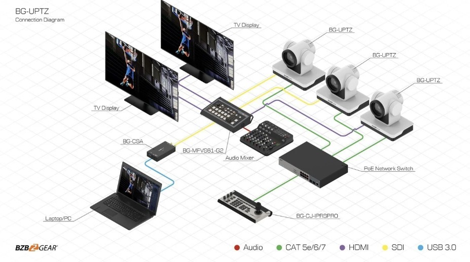 BG-UPTZ tilbyr avanserte tilkoblingsmuligheter. Den 1/2.8" Sony CMOS-sensoren leverer klare bilder opp til 1080p@60Hz. Med 12X, 20X og 30X zoom kan kameraet brukes i både små og store rom.