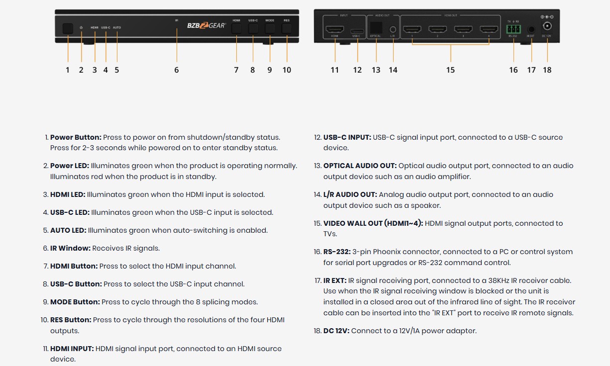 Den er designet for å fange, konvertere, rute og distribuere signaler i alle formater til videovegger med ekte digital signaloverføring. Kontrolleren støtter HDMI- og USB-C-innganger med oppløsninger opptil 4K@60Hz 4:4:4 og tilbyr fire HDMI-utganger. Den støtter flere videoveggmoduser og inkluderer optisk lydutgang samt L/R analog lydutkobling. Betjeningen er enkel og praktisk via frontpanelknapper, IR-fjernkontroll og RS-232-kommandoer.