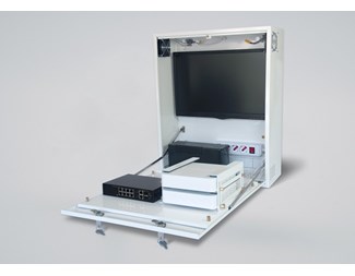 Her kan du montere skjerm for både VESA 75 og 100, enkel og problemfri montering av både NVR eller DVR, men også switcher siden de fleste deler i kabinettet er løse slik at du enkelt kommer til og kan feste utstyret. Flere ventilasjonshull med mulighet for å komplettere med vifter for bedre ventilasjon, kabelgjennomføring i bunnen. Kabinettet har også to låser som minimerer risikoen for at det kan brytes opp.