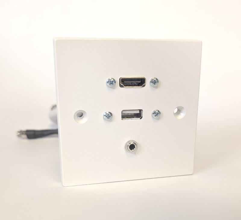 Praktisk vegguttak for standard veggboks eller kanal. Har uttak for 1 stk. HDMI 1.4, 1 stk. Minijack og 1 stk USB 2.0. 15 cm kabler på bakside gjør tilkobling til videre kabling enkelt. Leveres med skruer for feste.