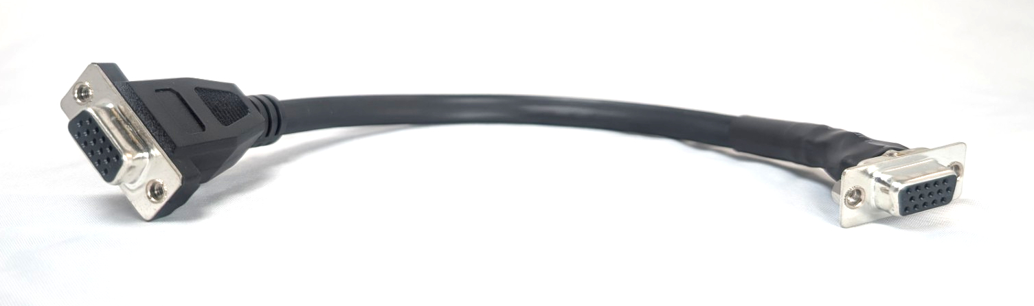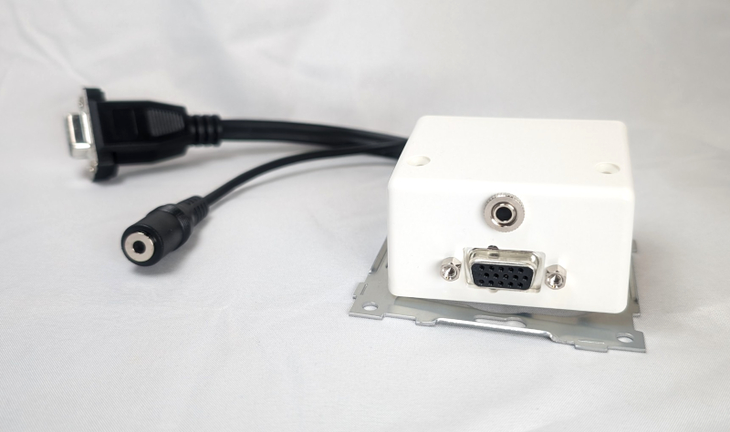 Skråstilt uttak for VGA og 3,5 mm stereo jack som passer standard ELKO bokser. Her får man et fast tilkoblingspunkt for lyd og bilde i påveggsboks eller kanal som gir mulighet for ryddig tilførsel og tilkobling av VGA bildesignal og stereo lydsignal til eventuell bortgjemt PC eller annen enhet. 15 cm lange kabler på bakside for praktisk tilkobling til signalkabler.