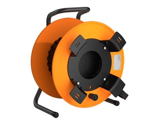 Kabeltrommel i slagfast plastmateriale med sidebrakett for opprulling av tilkoblingskabel og håndtak/fot i svart stål. Les mer