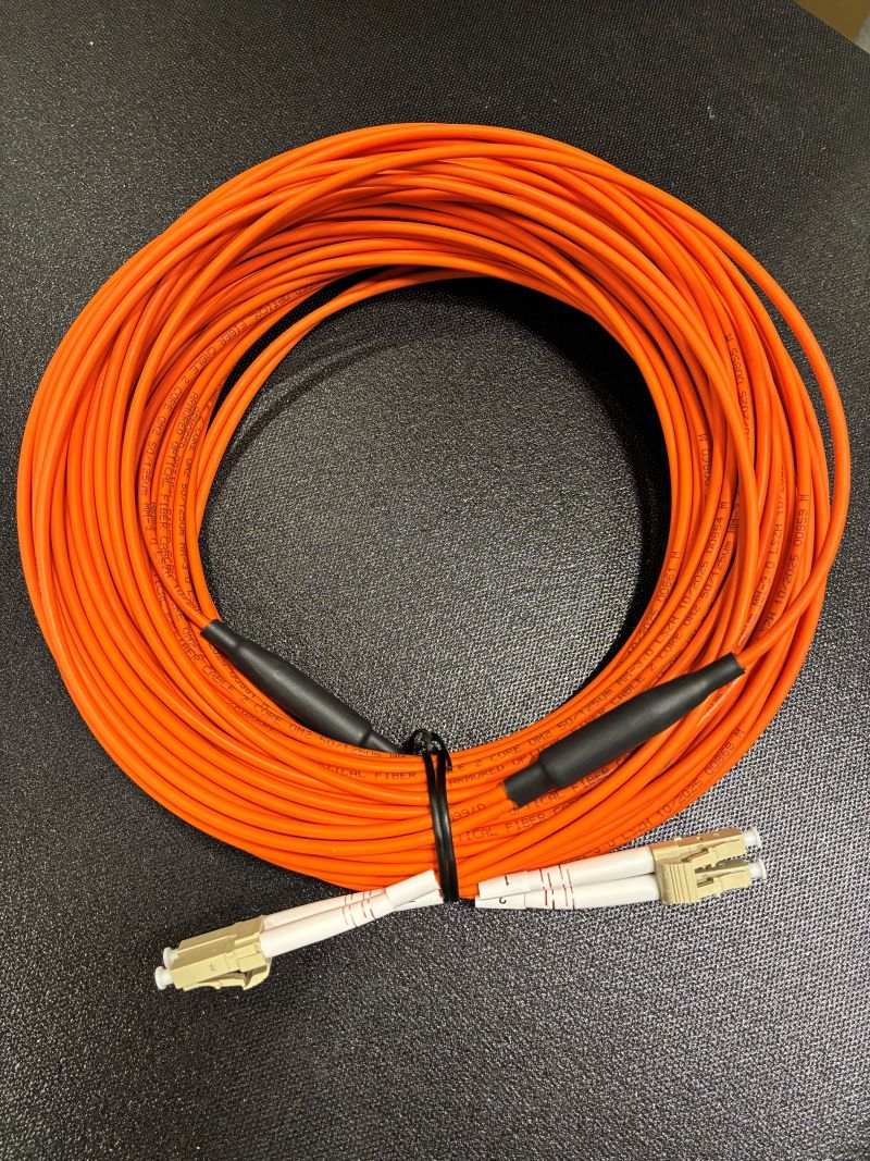 En 30-meters armert OM2 50/125 fiberpatch for innendørs bruk. Oransj kabel, ferdigterminert med LC-kontakter, Multimodus, Duplex.