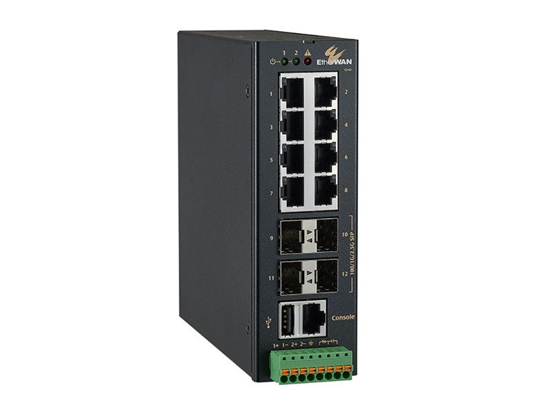 EX71924G-1NT er en herdet, administrerbar industrisvitsj med 8 porter 10/100/1000BASE-T(X) og 4 porter 100/1000/2500BASE SFP. Denne kombinasjonen gjør den godt egnet i nettverk der lokale enheter kobles til via kobber, samtidig som raskere og mer fremtidsrettede fiberuplinker brukes mellom skap, bygninger eller delsystemer. I praksis kan det dreie seg om et anlegg der IP-kameraer, PLC-er og I/O-enheter kobles lokalt, mens trafikken sendes videre over fiber til kontrollrom eller servermiljø.