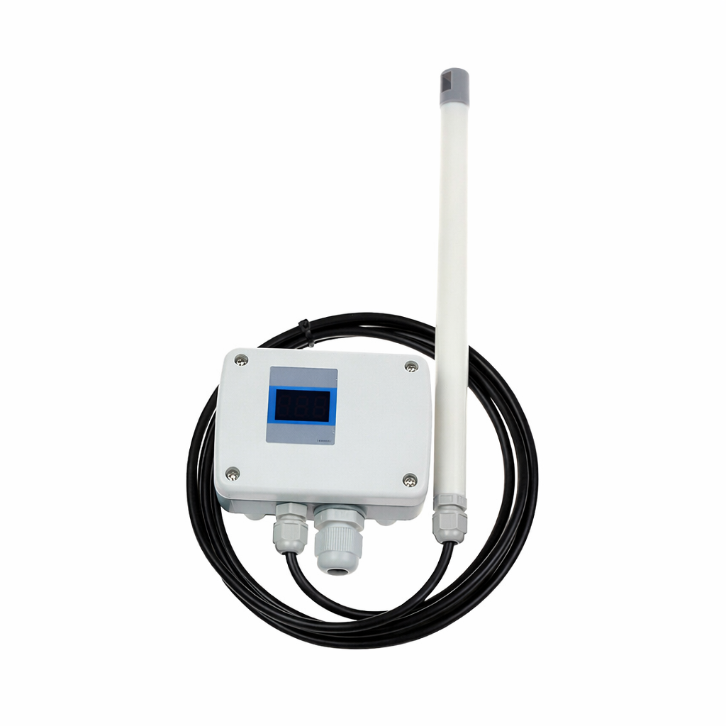 Den separate proben muliggjør optimal plassering i luftstrømmen, uavhengig av hvor kapslingen monteres. Den leveres med fast probe og kabel, noe som forenkler installasjon i ventilasjonskanaler, aggregater og tekniske rom med begrenset plass. Kabel til sensorprobe er 3 m som standard, kontakt oss dersom andre lengder ønskes.