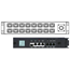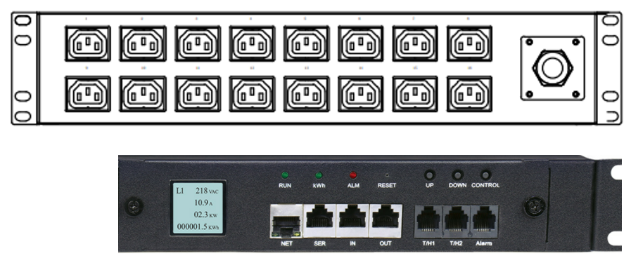Denne PDU-en har tilkoblingene til utstyret på baksiden, og display på forsiden. Det gjør at PDU-en kan monteres høyt oppe foran på racket, og at kablene kan legges fra baksiden av PDU-en til utstyret.
