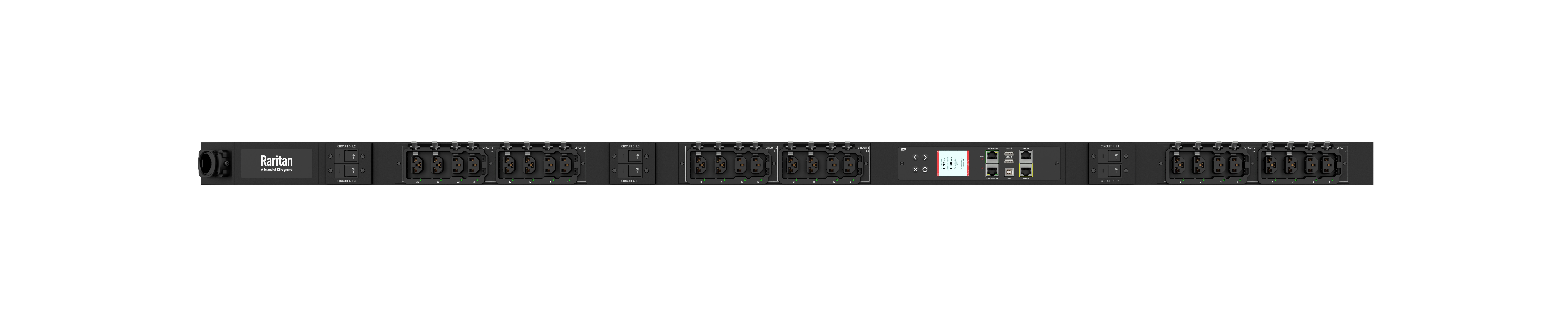 De patenterte HDOT Cx-uttakene er hybrider som støtter både IEC C14 (10 A) og C20 (16 A) kabler i samme uttak. Med 12 HDOT Cx-uttak og 12 standard C13-uttak får du: