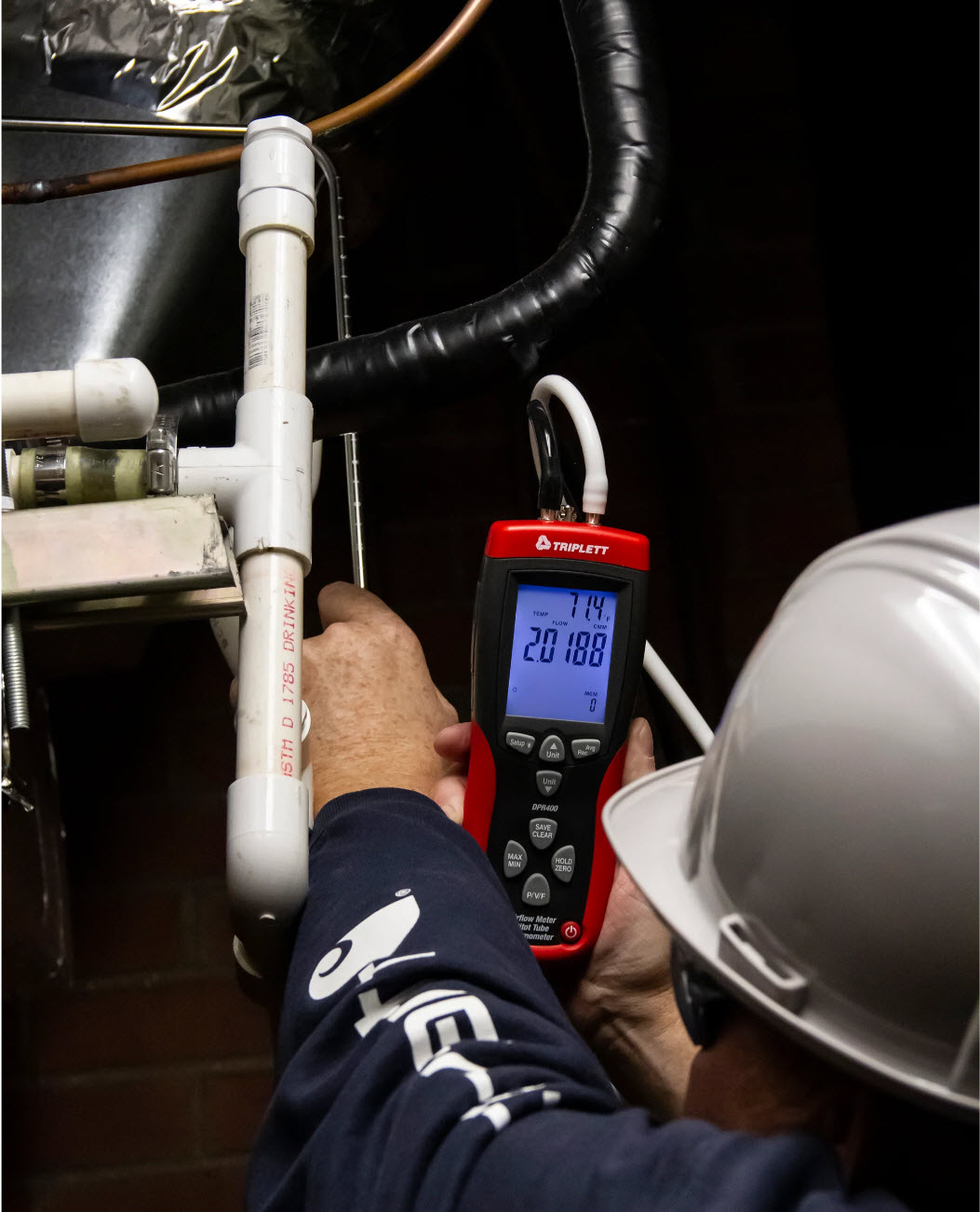 Med støtte for Pitot-rør og et tydelig, digitalt display kan brukeren raskt og effektivt måle luftstrøm i kanaler, kontrollere trykkfall over filtre og