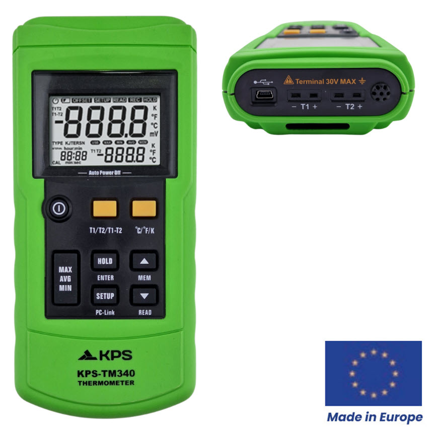 Termometeret TM340 dekker en rekke behov innenfor temperaturmåling. Det er kompatibelt med termoelementer av type J, K, T, E, R, S og N, og på det opplyste LCD-displayet vises maksimal-, minimums- og gjennomsnittsverdier i Celsius (°C), Fahrenheit (°F) og Kelvin (K).