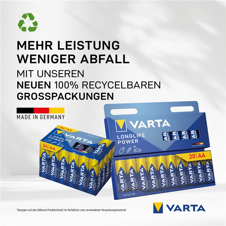 Ubrukte og emballerte VARTA AA-batterier kan holde seg ladet i opptil 10 år.