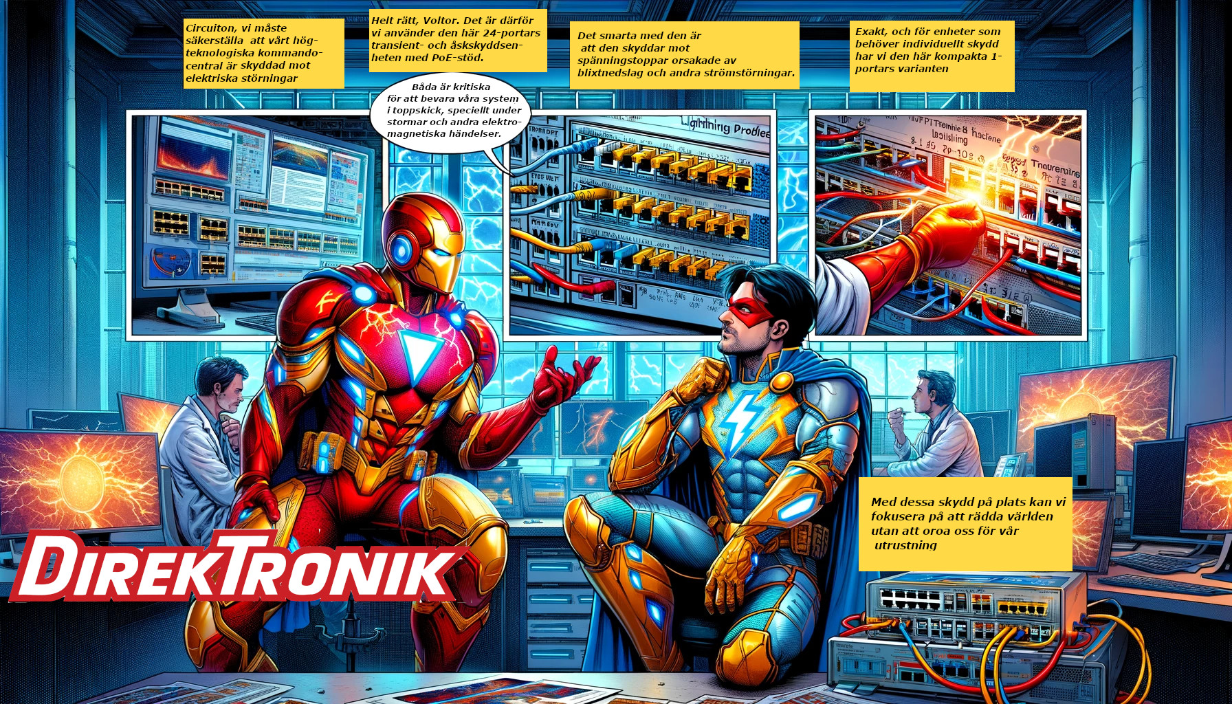 Overspenningsvern og Lynvern beskytter utstyret ditt mot elektrisk overslag. Ved et større elektrisk havari eller et nærliggende lynnedslag kan store mengder energi transporteres gjennom alle kobberkabler og skade servere, datamaskiner eller annet utstyr, f.eks. kameraer. Direktronik har beskyttelse for RJ45, BNC, Coax og giver-/sensorkabler (0-10V/4-