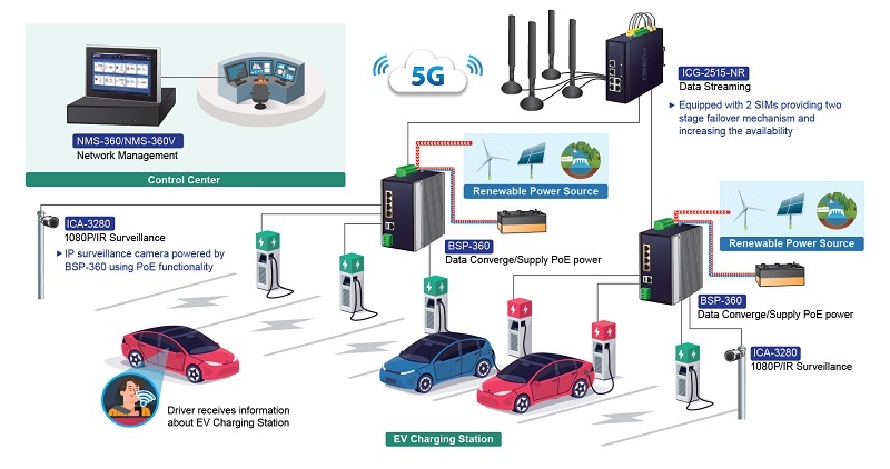 Ved å bruke en BSP-360 (Renewable Power Managed Ethernet Switch) kan nettverkstilkoblingen til ladestasjonen oppnå strøm som kan samle fornybar energi på egen hånd og sende data via 5G NR Cellular Gateway (ICG-2515-NR) til stasjonsoperatøren. 5G NR-nettverket vil tillate ladetjenesteleverandører å effektivt sende nyttig informasjon til brukerne, for eksempel stasjonsplassering, stasjonstilgjengelighet, prisinformasjon osv. Hele nettverket kan enkelt overvåkes og administreres av Renewable Energy Management Controller (NMS-360, NMS-360V) som automatisk kan oppdage opptil 512 eksterne enheter drevet av BSP-360.